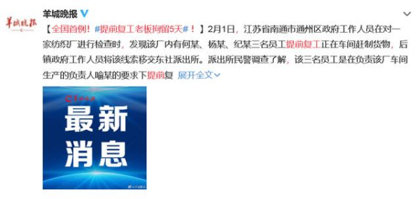 派出所民警調(diào)查了解,該三名員工是在負(fù)責(zé)該廠車間生產(chǎn)的負(fù)責(zé)人喻某的要求下提前復(fù)工的。喻某明知有延遲企業(yè)復(fù)工的相關(guān)通知,但因年前有一批貨物沒有做完,所以叫了部分工人復(fù)工希望可以早點(diǎn)趕制完工,涉嫌違反了《江蘇省人民政府辦公廳關(guān)于延遲企業(yè)復(fù)工的通知》。
