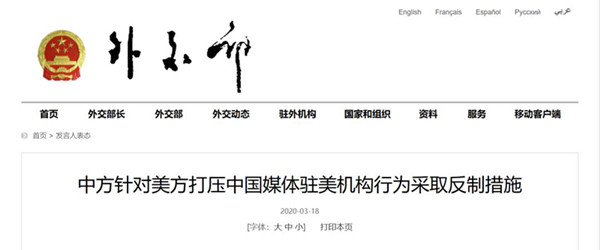近年來,美國政府對中國媒體駐美機構(gòu)和人員的正常新聞報道活動無端設(shè)限,無理刁難,不斷升級對中國媒體的歧視和政治打壓,特別是2018年12月美方要求有關(guān)中國媒體駐美機構(gòu)注冊為“外國代理人”,2020年2月將5家中國媒體駐美機構(gòu)列為“外國使團”,隨即又對上述5家媒體駐美機構(gòu)采取人數(shù)限制措施,變相大量“驅(qū)逐”中方媒體記者。中方第一時間就美方錯誤做法向美方提出嚴正交涉,表達堅決反對和強烈譴責,并強調(diào)保留做出反應(yīng)和采取措施的權(quán)利。