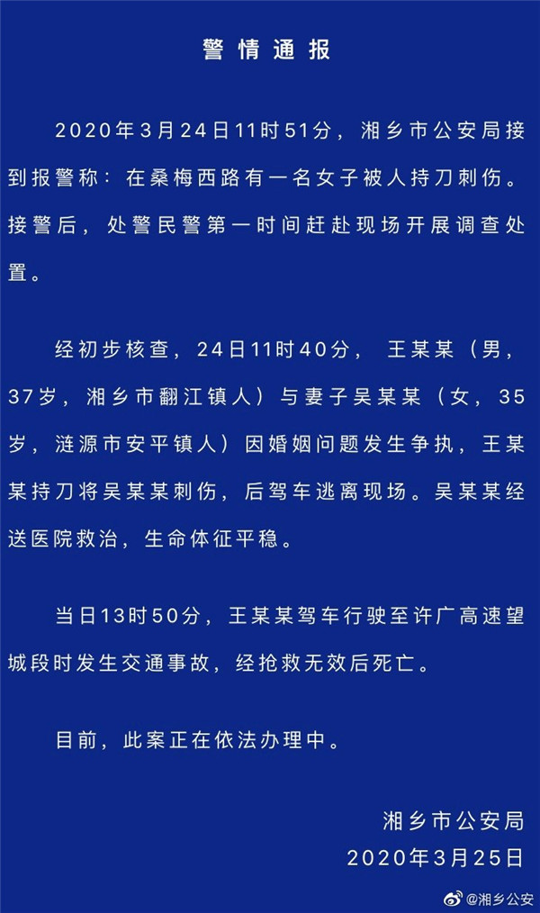 經初步核查,24日11時40分, 王某某(男,37歲,湘鄉市翻江鎮人)與妻子吳某某(女,35歲,漣源市安平鎮人)因婚姻問題發生爭執,王某某持刀將吳某某刺傷,后駕車逃離現場。吳某某經送醫院救治,生命體征平穩。