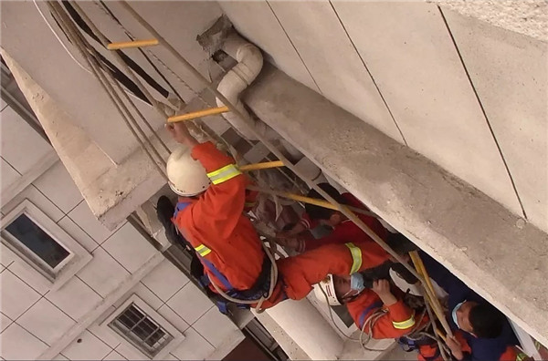 20多分鐘后,消防員、公安、救援隊相繼趕到。兩名消防員一個從樓頂用軟梯到達平臺,用身體護住孩子,給孩子系上安全繩;另一個爬出窗口,接力將兩個孩子依次救回。整個救援過程不到半個小時。大家懸著的心終于放了下來。