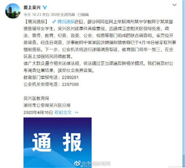 近日,部分網民在網上舉報浙江湖州某中學教師寧某某曾猥褻輔導女學生。16日,@愛上吳興 通報表示,吳興區對此事件高度重視,迅速成立由相關區領導負責,政法、宣傳、教育、紀委、監委、公安、檢察等部門組成的聯合調查組,全方位開展調查。經連日調查,涉事教師寧某某因涉嫌強制猥褻罪已于4月16日被采取刑事強制措施。下一步,公安機關將進行詳細調查取證,教育部門將舉一反三,在全區面上加強師風師德教育。請廣大群眾遵守相關法律法規,依法通過正當渠道反映相關情況。我們將及時公布調查處置結果,接受社會各界監督。