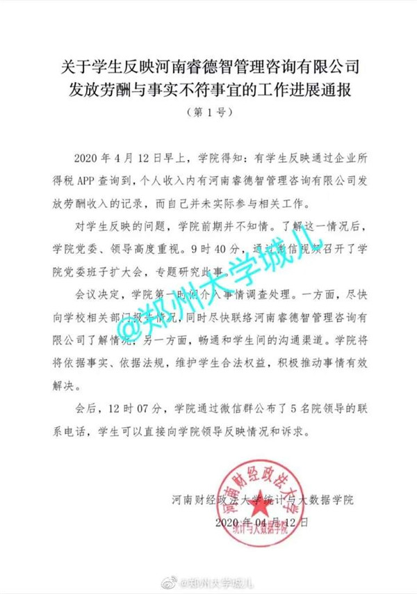 河南財(cái)經(jīng)政法大學(xué)也就此事發(fā)出通報(bào),稱學(xué)院前期對(duì)學(xué)生反映的情況并不知情,已經(jīng)第一時(shí)間調(diào)查處理,除了與學(xué)生保持溝通,同時(shí)也在積極聯(lián)絡(luò)河南睿德智管理咨詢有限公司,維護(hù)學(xué)生合法權(quán)益。