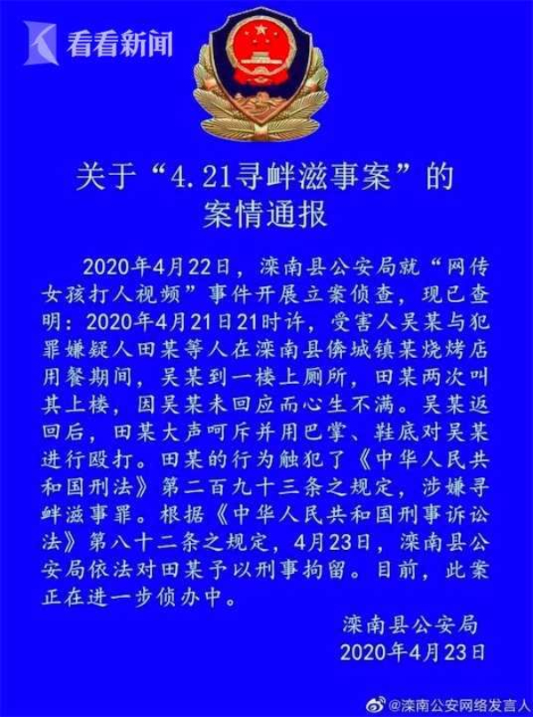 通報稱,2020年4月22日,灤南縣公安局就“網傳女孩打人視頻”事件開展立案偵查,現已查明:2020年4月21日21時許,受害人吳某與犯罪嫌疑人田某等人在灤南縣倴城鎮某燒烤店用餐期間,吳某到一樓上廁所,田某兩次叫其上樓,因吳某未回應而心生不滿。吳某返回后,田某大聲呵斥并用巴掌、鞋底對吳某進行毆打。田某的行為觸犯了《中華人民共和國刑法》第二百九十三條之規定,涉嫌尋釁滋事罪。根據《中華人民共和國刑事訴訟法》第八十二條之規定,4月23日,灤南縣公安局對田某予以刑事拘留。