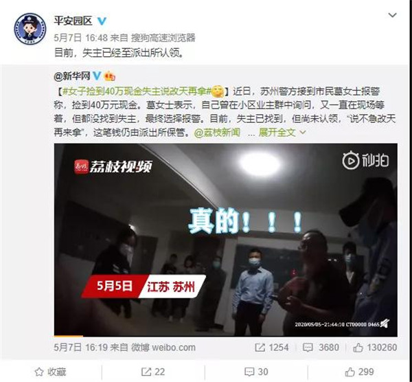 據(jù)江蘇省蘇州市公安局工業(yè)園區(qū)分局官方微博:目前,失主已經(jīng)至派出所認(rèn)領(lǐng)。