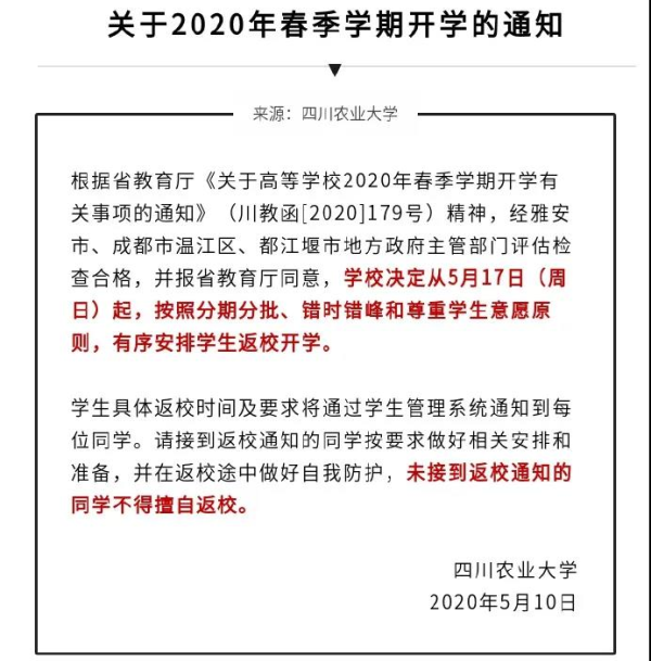 四川農(nóng)業(yè)大學正式發(fā)布《關于2020年春季學期開學的通知》,學生自5月17日起,分期分批、錯時錯峰返校。未接到返校通知的同學不得擅自返校。