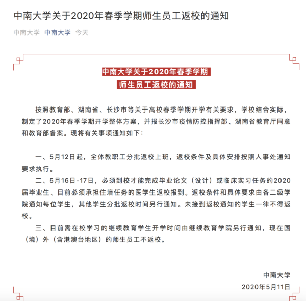 今天,湖南大學發(fā)布通知稱,2020年5月14日起,畢業(yè)年級本科生和畢業(yè)年級研究生經(jīng)申請可返校。其他學生返校時間根據(jù)疫情防控形勢另行通知。