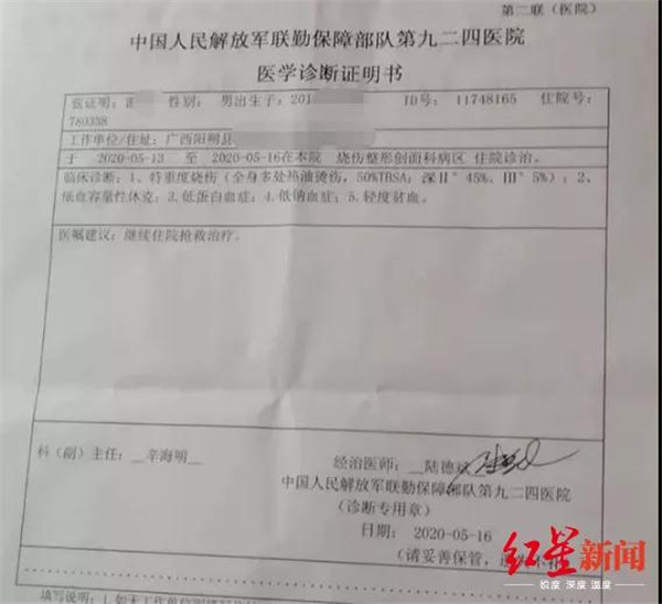 在一張中國人民解放軍聯(lián)勤保障部隊(duì)第九二四醫(yī)院出具的醫(yī)學(xué)診斷證明書上看到,小雷于2020年5月13日入住該院燒傷整形創(chuàng)面科病區(qū)進(jìn)行診治,臨床診斷結(jié)果為特重度燒傷(全身多處熱油燙傷,50%TBSA:深I(lǐng)I°45%、III°5%)。(注:TBSA即體表總面積)