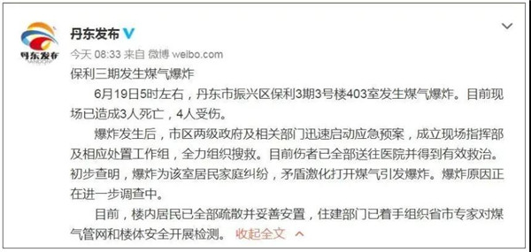 6月19日5時左右,遼寧省丹東市振興區(qū)保利小區(qū)發(fā)生煤氣爆炸。目前現(xiàn)場已造成3人死亡,4人受傷。