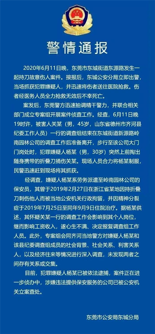 案發后,東莞警方迅速抽調精干警力,并聯合相關部門成立專案組開展案件偵查工作。經查,6月11日晚19時許,被害人關某(男,45歲,山東省德州市齊河縣紀委工作人員)一行的調查組結束在東城街道新源路嶺南園林公司的調查工作后準備離開,步行至該公司大門門崗處時,犯罪嫌疑人楊某(男,30歲)突然上前掏出隨身攜帶的折疊刀捅傷關某。現場人員合力將楊某制服,民警迅速趕到現場將其抓獲。