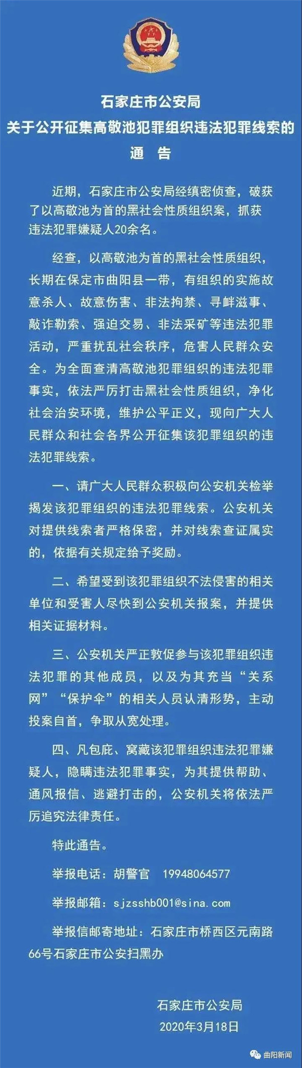 據(jù)通告內(nèi)容,石家莊市公安局破獲了以高敬池為首的黑社會性質(zhì)組織案,抓獲違法犯罪嫌疑人20余名。經(jīng)查,以高敬池為首的黑社會性質(zhì)組織,長期在保定市曲陽縣一帶,有組織地實施故意殺人、故意傷害、非法拘禁、尋釁滋事、敲詐勒索、強迫交易、非法采礦等違法犯罪活動。