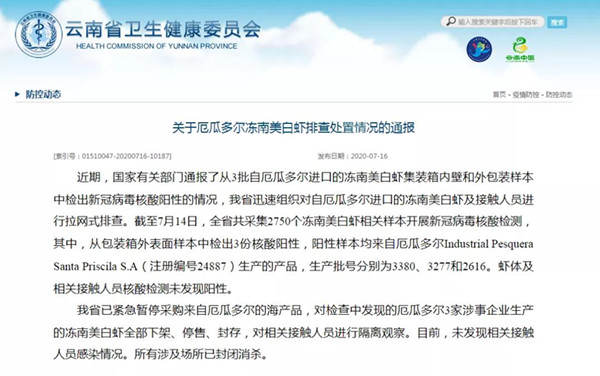 截至7月14日,云南省共采集2750個凍南美白蝦相關樣本開展新冠病毒核酸檢測,其中,從包裝箱外表面樣本中檢出3份核酸陽性,陽性樣本均來自厄瓜多爾Industrial Pesquera Santa Priscila S.A(注冊編號24887)生產的產品,生產批號分別為3380、3277和2616。蝦體及相關接觸人員核酸檢測未發現陽性。云南省已緊急暫停采購來自厄瓜多爾的海產品,對檢查中發現的厄瓜多爾3家涉事企業生產的凍南美白蝦全部下架、停售、封存,對相關接觸人員進行隔離觀察。目前,未發現相關接觸人員感染情況。所有涉及場所已封閉消殺。
