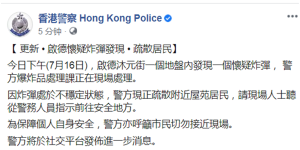 香港警方說,炸彈處于不穩定狀態,至今疏散約2000人。警方爆炸品處理課人員已到場處理。啟德小區會堂會用作臨時安置中心。