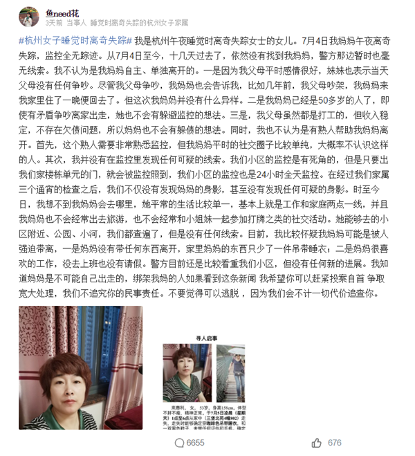 認證為“當事人 睡覺時離奇失蹤的杭州女子家屬”的網友“魚need花”發文表示自己是來女士大女兒,她不認同上述網友的猜測,懷疑媽媽是被人綁架走的。
