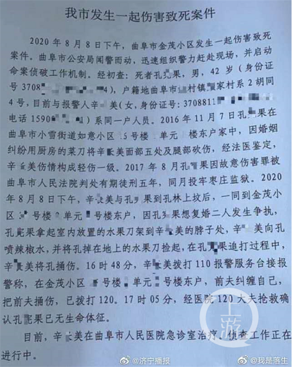 8月8日,孔某果與前妻辛某美因復婚起爭執,孔某果拿起水果刀架到辛某美的脖子處,在孔某果追打過程中,辛某美將孔捅傷不治身亡。圖片來源/濟寧播報
