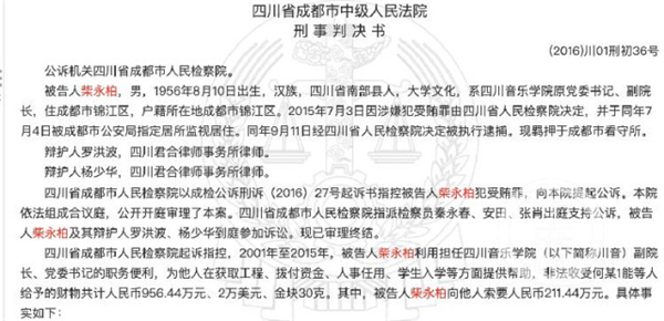 成都市中院一審查明,柴永柏于2001年4月從川北醫學院調至川音擔任副院長,負責學校校產、基建、保衛、后勤中心等工作。2005年3月起,柴永柏擔任川音黨委書記、副院長,全面主持川音黨委工作,分管黨委辦公室、組織部、宣傳統戰部等方面工作。