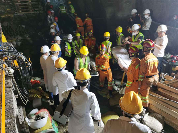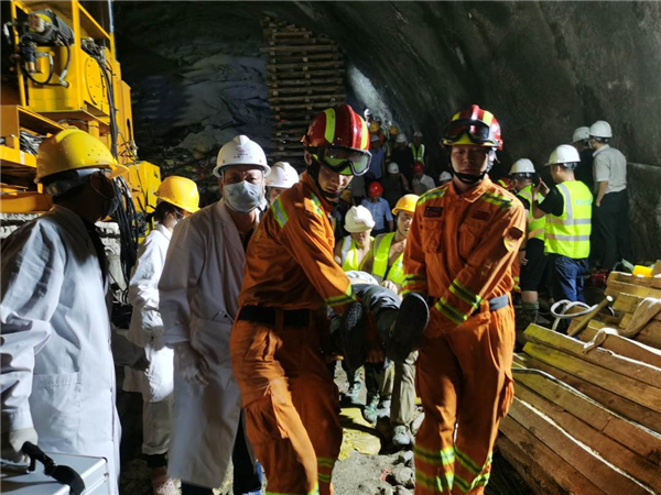 在現(xiàn)場(chǎng),聯(lián)合指揮部迅速確定了大口徑水平鉆機(jī)機(jī)械救援和小導(dǎo)坑人工救援同步推進(jìn)的綜合救援方案,在聯(lián)合指揮部的精心組織下,施救人員晝夜奮戰(zhàn),科學(xué)有序完成鉆機(jī)平臺(tái)填筑、坍體防護(hù)加固、三臺(tái)階工作平臺(tái)構(gòu)筑、洞頂變形鋼拱架井字架支撐、坍體頂部噴漿和封閉加固等工作。在大口徑水平鉆機(jī)鉆進(jìn)的同時(shí),由中鐵隧道局、中鐵十七局、中鐵十九局、中交一航局救援人員組成的小導(dǎo)坑人工救援組,順利開辟了救援通道,成功解救被困人員。