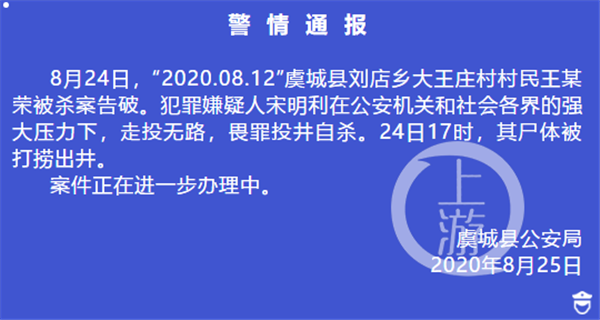 8月25日,虞城縣公安局發布通報稱,8月24日,“2020.08.12”虞城縣劉店鄉大王莊村村民王某榮被殺案告破。犯罪嫌疑人宋明利在公安機關和社會各界的強大壓力下,走投無路,畏罪投井自殺。24日17時,其尸體被打撈出井。案件正在進一步辦理中。
