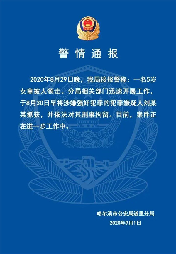 9月1日,據哈爾濱平安道里微警務消息,2020年8月29日晚,我局接報警稱:一名5歲女童被人領走。分局相關部門迅速開展工作,于8月30日早將涉嫌強奸犯罪的犯罪嫌疑人劉某某抓獲,并依法對其刑事拘留。目前,案件正在進一步工作中。