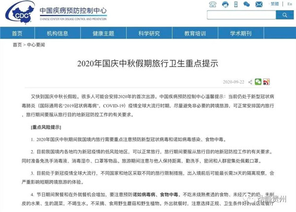 事關國慶中秋旅行!中國疾控中心發布提示!