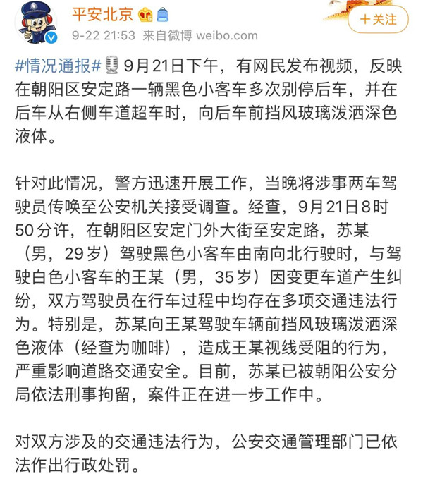 9月22日晚,@平安北京 發(fā)布通報,潑咖啡的車主蘇某已被刑事拘留。