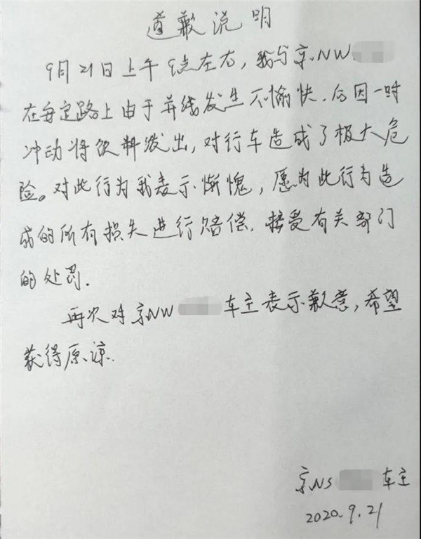 21日晚,潑飲料的“京NS”車主在微博發(fā)布手寫的“道歉說明”:“9月21日上午9點左右,我與京NW85XX在定路上由于并線發(fā)生不愉快。后因一時沖動將飲料潑出,對行車造成極大危險。對此行為我表示慚愧,愿此行為造成的損失進行賠償,接受有關部門的處罰。再次對京NW85XX車主表示歉意,希望獲得原諒。”