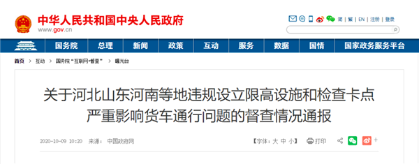 近日,根據群眾在國務院“互聯網+督查”平臺反映的問題線索,國辦督查室派員赴河北、山東、河南等地進行了明察暗訪,發現石家莊市、聊城市、淄博市、安陽市普遍存在違規在國省干道、農村公路及城區外環主要過境通道限高設卡、隨意執法等問題,嚴重影響貨車通行效率和道路交通安全。