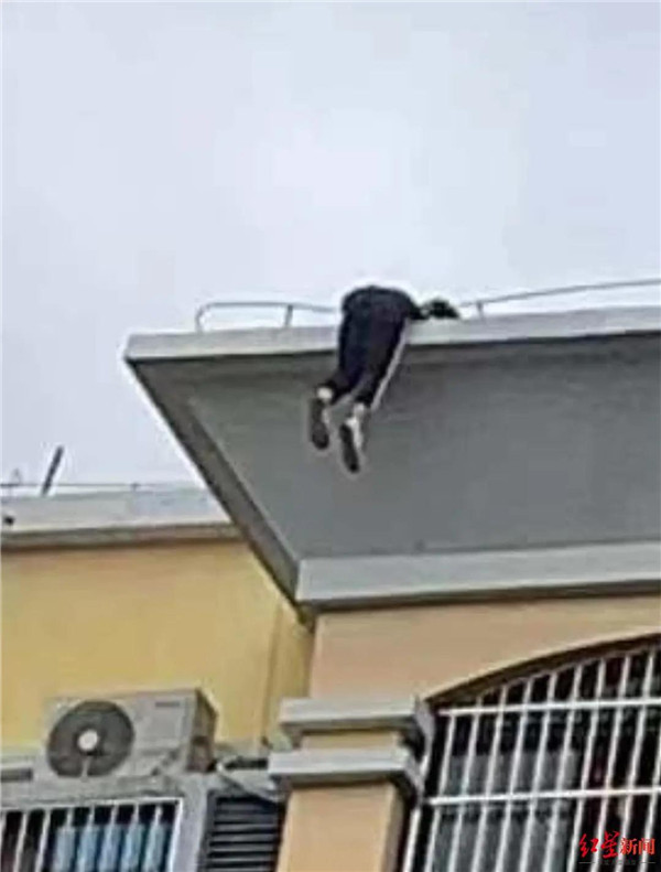 ▲女孩抓住樓頂護欄向下探身(圖據網絡)