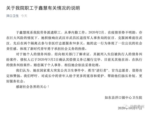 江蘇省南通市如東縣洋口鎮中心衛生院今晚通過官微發布院職工于鑫慧有關情況的說明。說明全文如下:
