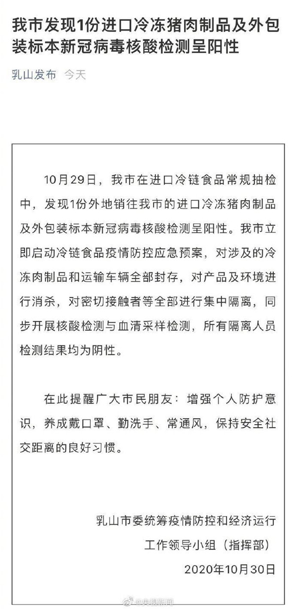 據乳山發布:10 月 29 日,山東乳山在進口冷鏈食品常規抽檢中,發現 1 份外地銷往乳山市的進口冷凍豬肉制品及外包裝標本新冠病毒核酸檢測呈陽性。乳山市立即啟動冷鏈食品疫情防控應急預案,對涉及的冷凍肉制品和運輸車輛全部封存,對產品及環境進行消殺,對密切接觸者等全部進行集中隔離,同步開展核酸檢測與血清采樣檢測,所有隔離人員檢測結果均為陰性。