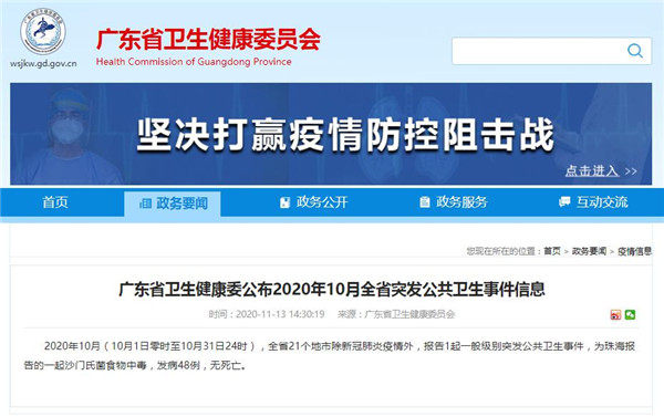 11 月 13 日,廣東省衛生健康委公布 10 月全省突發公共衛生事件信息,10 月 1 日零時至 10 月 31 日 24 時,廣東全省 21 個地市除新冠肺炎疫情外,報告 1 起一般級別突發公共衛生事件,為珠海報告的一起沙門氏菌食物中毒,發病 48 例,無死亡。