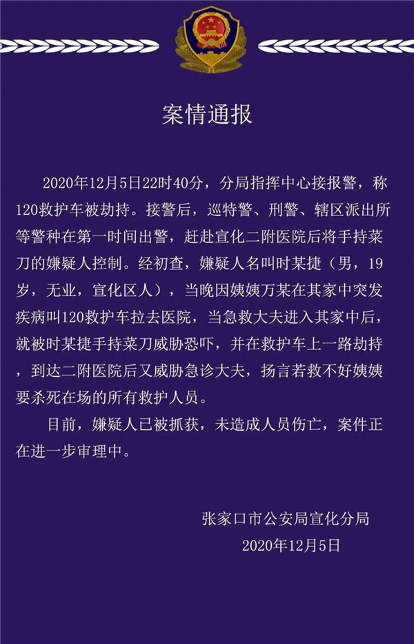12 月 5 日夜,河北省張家口市宣化區河北北方學院附屬第二醫院一輛 120 救護車被劫持。記者從宣化公安分局獲悉,案發后,該局巡特警、刑警、轄區派出所等警種在第一時間出警,趕赴宣化二附醫院后將手持菜刀的嫌疑人控制。