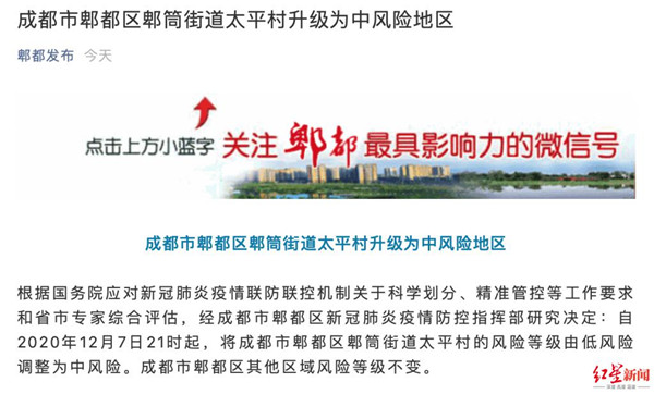 12 月 7 日,據郫都發布官方微信消息,根據國務院應對新冠肺炎疫情聯防聯控機制關于科學劃分、精準管控等工作要求和省市專家綜合評估,經成都市郫都區新冠肺炎疫情防控指揮部研究決定:自 2020 年 12 月 7 日 21 時起,將成都市郫都區郫筒街道太平村的風險等級由低風險調整為中風險。成都市郫都區其他區域風險等級不變。