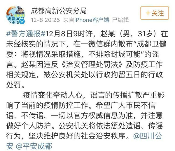 12 月 8 日,據成都高新公安分局通報,12 月 8 日 9 時許,趙某(男,31 歲)在未經核實的情況下,在一微信群內散布 " 成都衛健委:將視情況采取措施,不排除封城可能 " 的謠言。趙某因違反《治安管理處罰法》及防疫工作相關規定,被公安機關處以行政拘留五日的行政處罰。