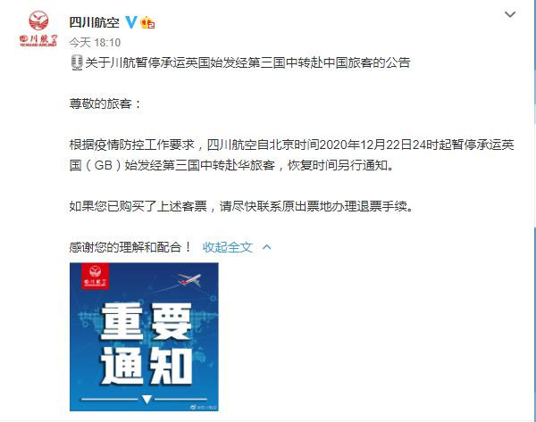 12 月 22 日晚,四川航空公告,根據疫情防控工作要求,四川航空自北京時間 2020 年 12 月 22 日 24 時起暫停承運英國(GB)始發經第三國中轉赴華旅客,恢復時間另行通知。