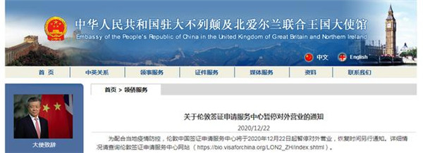 中國駐英國大使館網站 12 月 22 日消息,駐英國大使館發布《關于倫敦簽證申請服務中心暫停對外營業的通知》:為配合當地疫情防控,倫敦中國簽證申請服務中心將于 2020 年 12 月 22 日起暫停對外營業,恢復時間另行通知。詳細情況請查詢倫敦簽證申請服務中心網站。