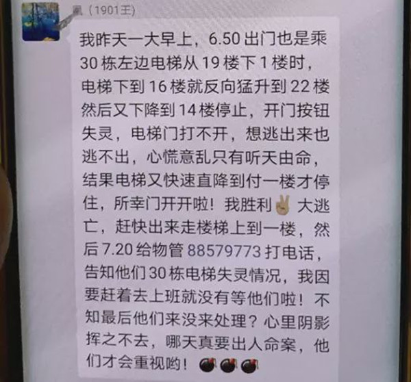 小區業主:從19樓下到1樓時,電梯下到16樓時就反向猛升到22樓,然后又下降到14樓停止,開門按鈕失靈,電梯門打不開,當時心慌意亂只有聽天由命。