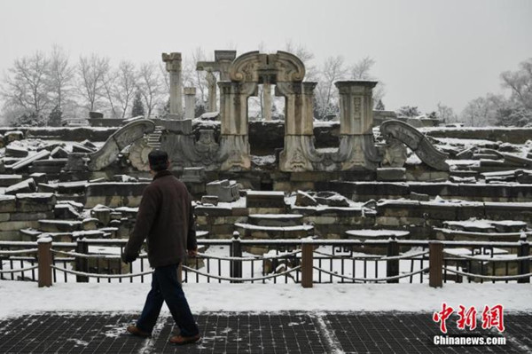 12月16日,北京迎來大雪天氣,一名游客在圓明園內欣賞雪景。中新社記者 崔楠 攝