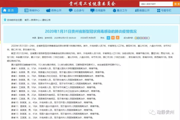 截至1月31日24時,全省累計報告新型冠狀病毒感染的肺炎病例29例。其中,外地來黔人員16例,本省常住人口13例;治愈出院2例,病情平穩(wěn)22例,重癥5例;男性16例,女性13例;年齡最大80歲,最小10歲;貴陽市4例(1例已治愈),遵義市4例,六盤水8例,畢節(jié)市3例,銅仁市3例(1例已治愈),黔東南州2例,黔南州4例,黔西南州1例。現(xiàn)有疑似病例67例。