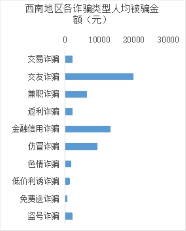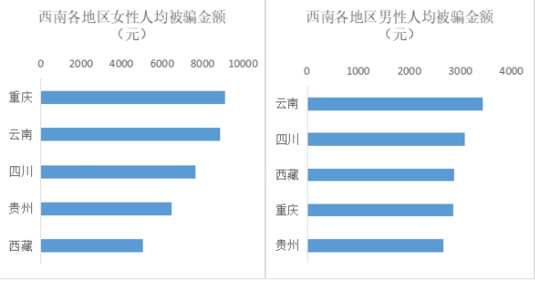 從各地區男女人均被騙金額看,重慶女性人均被騙金額最高,其次為云南,而云南男性人均被騙金額在男性群體中最高,其次為四川。