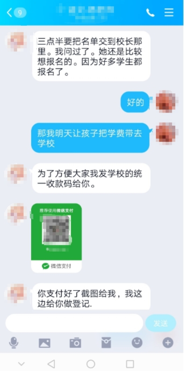 詐騙團伙往往會仿冒成財務、客服、物業、老師等身份實施詐騙,讓人防不勝防。去年8月,重慶的楊女士收到一位老師的消息,對方稱楊女士的小孩報名參加了學校的培訓班,需要盡快支付學費。隨后,對方發來了一個二維碼讓楊女士掃碼支付。楊女士信以為真,沒有驗證和核實就支付了款項。事后和其他家長交流時才發現,這位“老師”其實是偽裝仿冒潛入家長群的騙子。通過私下聯系家長,逐個實施詐騙。