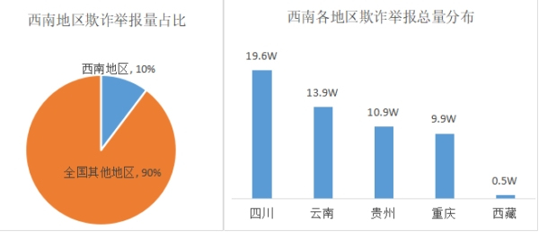 2019年騰訊110受理西南地區網絡欺詐舉報量54.8萬,占全國舉報量的10%,其中,四川舉報量最高,欺詐舉報量19.6萬例,其次是云南、貴州、重慶,分別為13.9萬例、10.9萬例、9.9萬例。