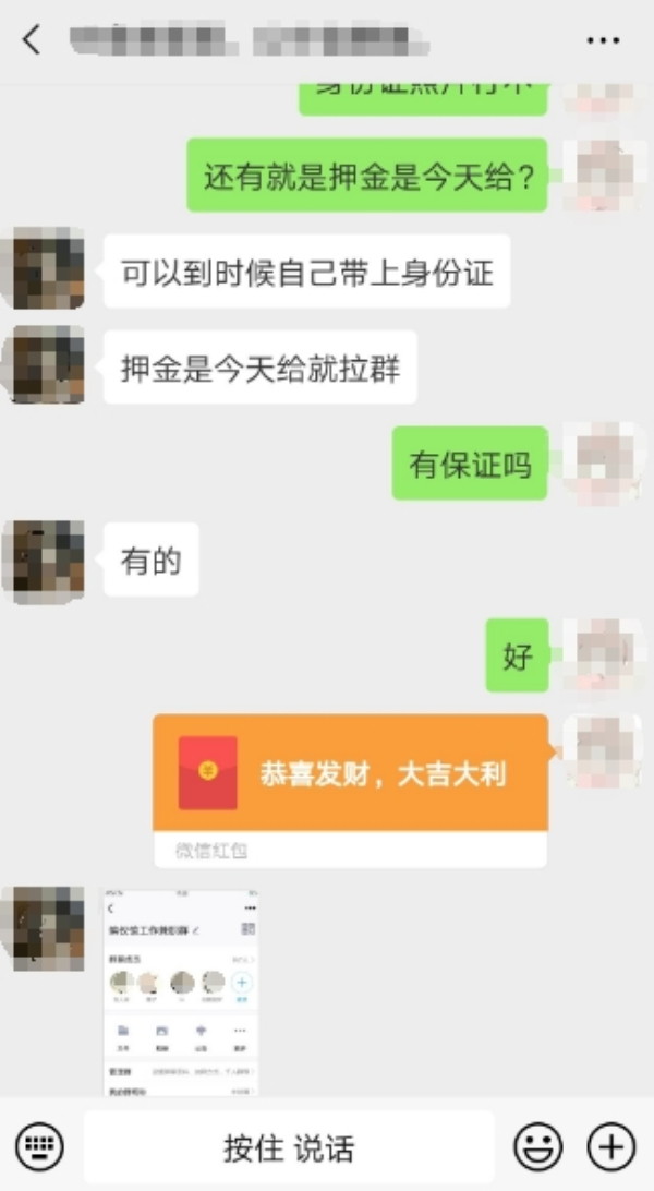 不料,在符同學約好報到的前一天,對方提出需繳納工作服和工作鞋押金費用,否則不接受新職員。符同學無奈下支付了費用,對方收取后便將其拉黑。符同學這才發現自己已經上當。