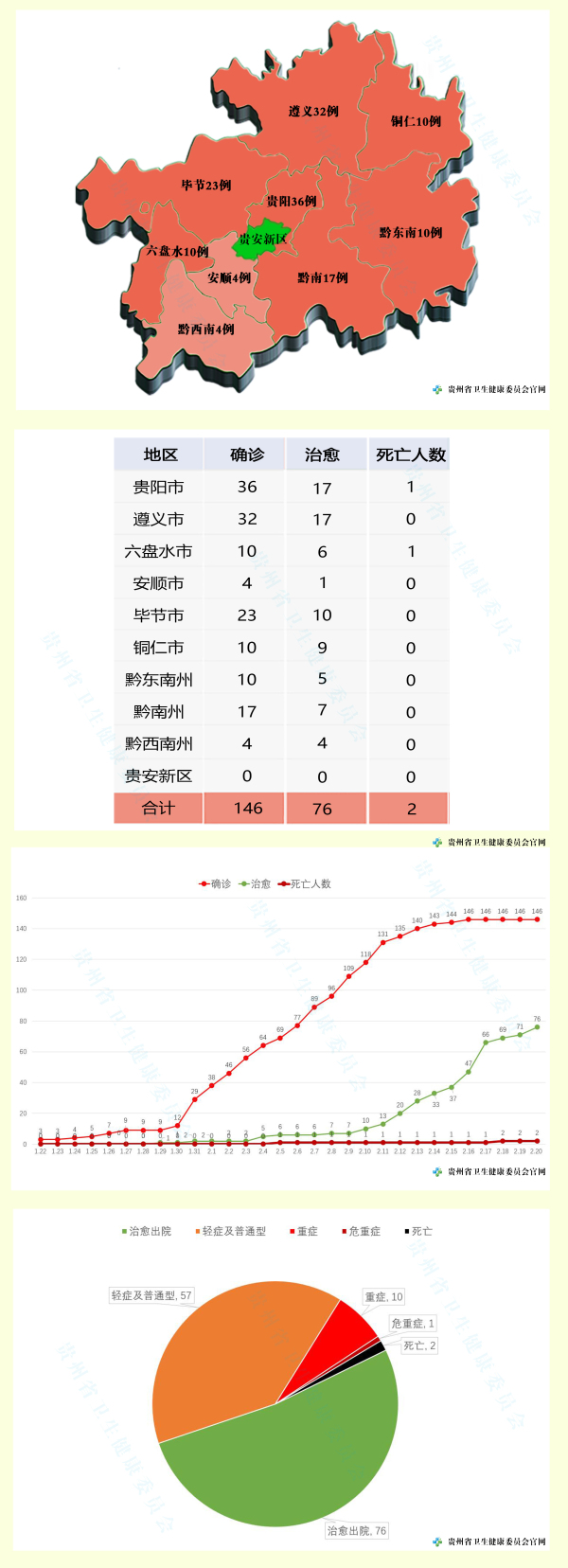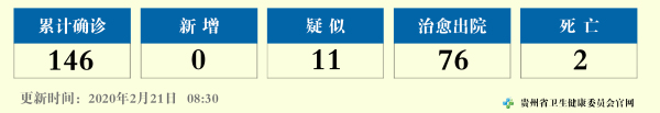 2020年2月20日12—24時,全省新型冠狀病毒肺炎無新增確診病例,新增治愈出院病例4例,其中:貴陽市3例、黔東南州1例。