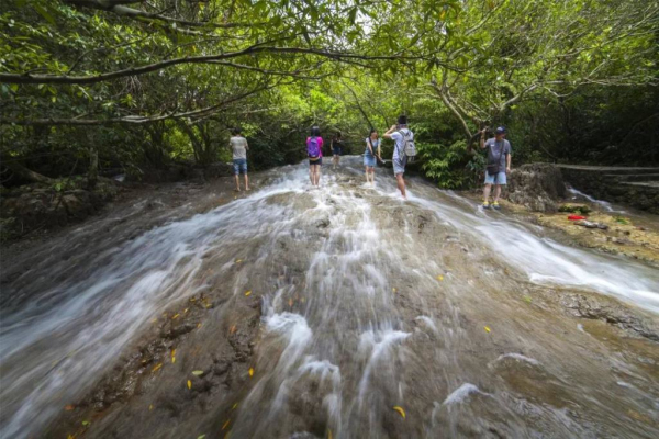 水上森林,這里的千百株樹木,包括珍奇樹木數十種,全都植根于水中的頑石上,又透過頑石扎根于河床,造就了這幅水中有石,石上有樹,樹植水中,水、石、樹相偎相依的奇景,遠遠望去宛如漂在水上的森林。