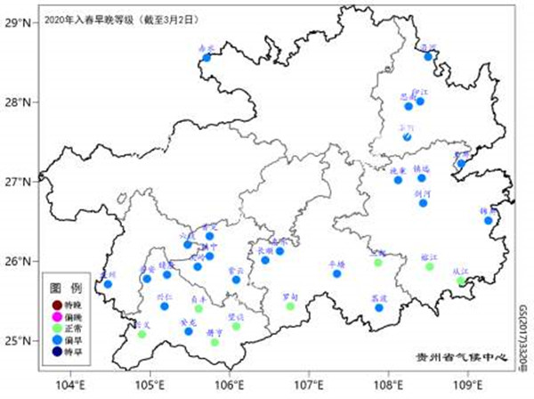 截至3月2日,全省已有32縣(市、區)入春,主要分布在省中部以南和以東地區,入春時間主要集中在2月中旬末到下旬中前期,24縣(市、區)較常年(1981-2010年)偏早,8縣(市、區)正常,全省最早入春為我省無冬區的望謨、冊亨和羅甸3縣。