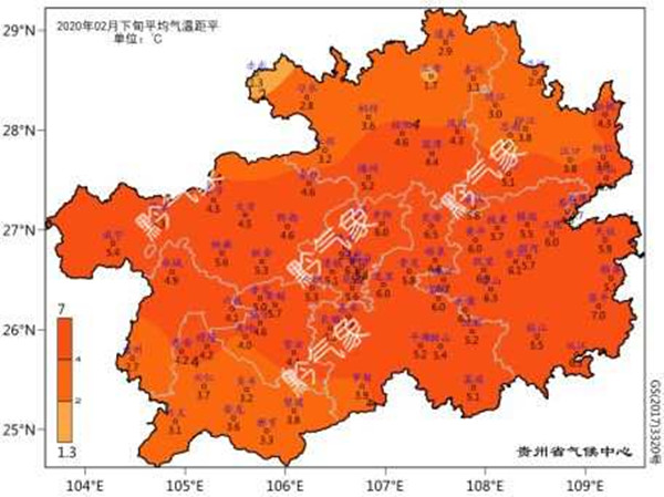 2月下旬我省平均氣溫在8.9(習水)-17.9(羅甸)之間,與常年同期相比,偏高1.3-7℃,為1961年以來歷史同期第6高值。