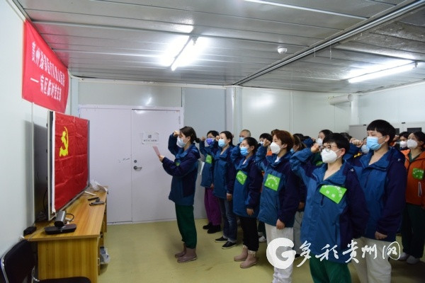 雷山醫院三病區,醫療一組臨時黨支部的21名預備黨員正在舉行莊重的入黨宣誓儀式。他們因在抗疫一線表現突出,經前線黨組織研究決定,被批準火線入黨。