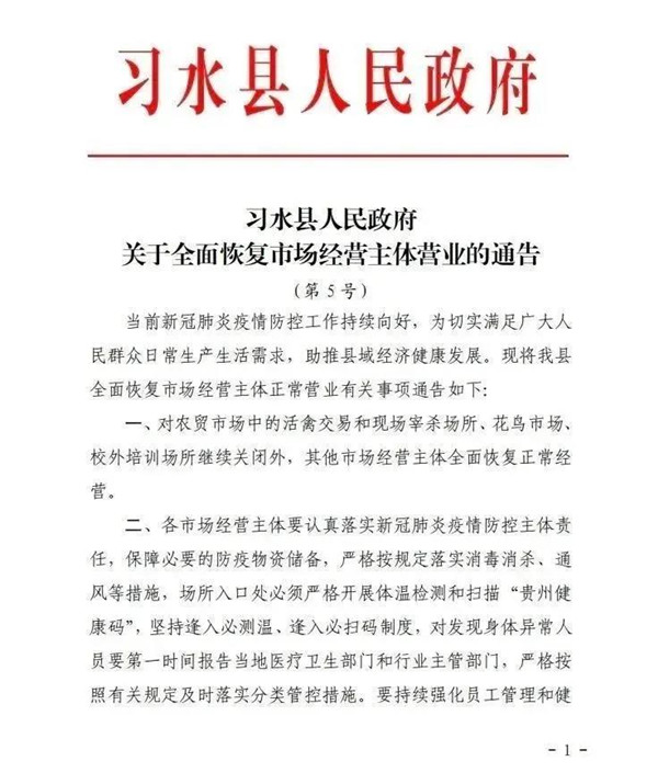 3月21日,習(xí)水縣人民政府關(guān)于全面恢復(fù)市場(chǎng)經(jīng)營(yíng)主體營(yíng)業(yè)的通告: