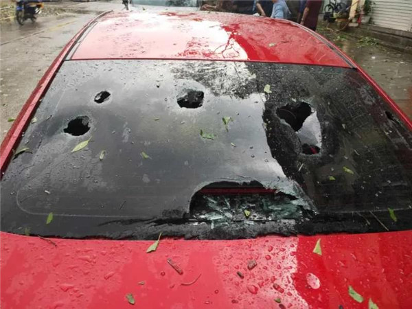 當(dāng)?shù)厝朔Q,冰雹直沖而下,有的比雞蛋大,砸下后樹枝紛紛掉落、房屋瓦片盡碎,汽車玻璃洞穿……有村民在冰雹降下后躲閃不及受傷。