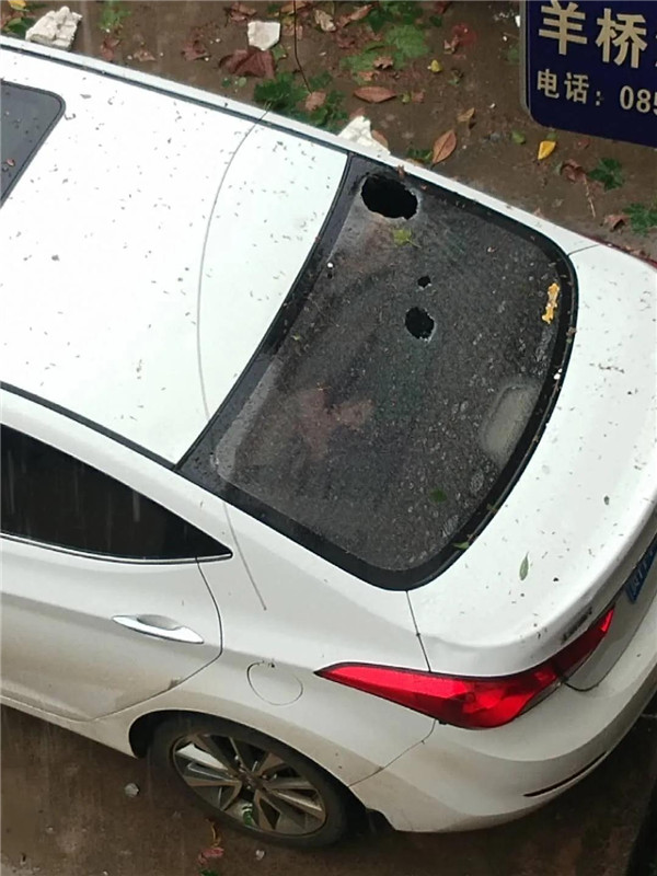 5月4日傍晚,黔東南州岑鞏縣突降冰雹,造成部分房屋受損,汽車玻璃被砸壞。
